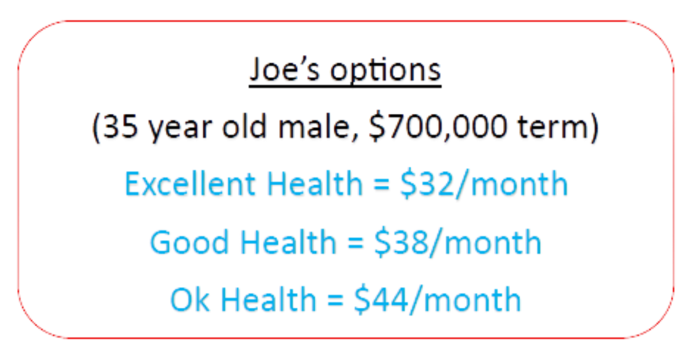 It’s easier to paint a picture, so let’s take a look at Average Joe. Joe is 35 years old, earns $60,000 a year and is married with 1 kiddo. The quick and easy way to assess how much life insurance Joe needs is amount equal to roughly ten to twelve times his annual income. For Joe that would a be a $600,000 to$720,000 Policy, let’s say Joe opts for a $700,000 Policy.